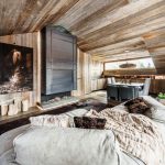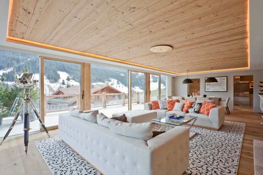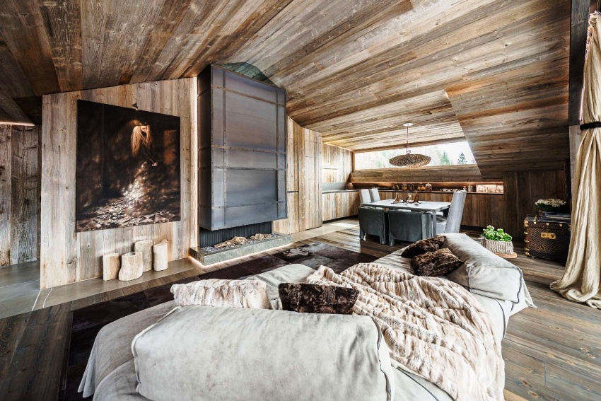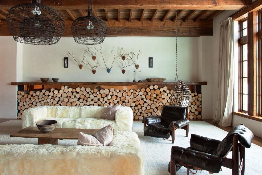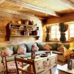 Gaya chalet yang turun dari Pegunungan Alpen tetap relevan hingga ke hari ini. Benar, kediaman moden berbeza dengan tempat tinggal sementara para gembala. Ke arah inilah rumah dirancang di resort ski. Gaya ini sesuai untuk pencinta alam dan harmoni untuk membuat bahagian dalam pondok desa. Chalet menggunakan bahan semula jadi: batu dan kayu - dalam pembinaan dan perabot, kapas, linen dan bulu - sebagai elemen tekstil. Atribut penting dari gaya ini adalah kulit binatang dan balok siling, yang menggabungkan: