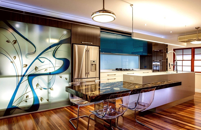 Bahan buatan digunakan secara meluas untuk hiasan, seperti lamina, kaca, logam, kertas dinding, plastik dan batu buatan. Tidak ada syarat untuk pilihan warna. Ciri ciri dalaman kontemporari: