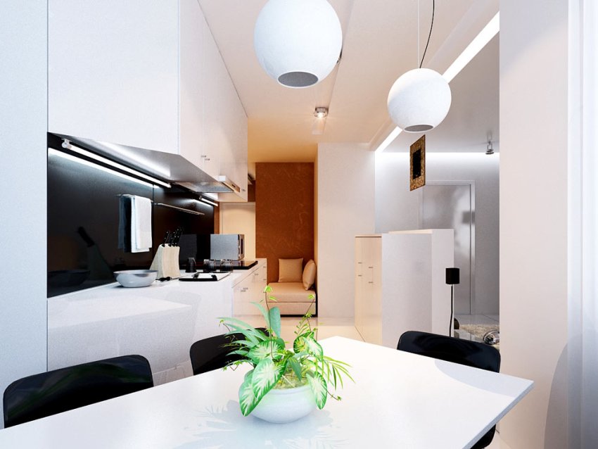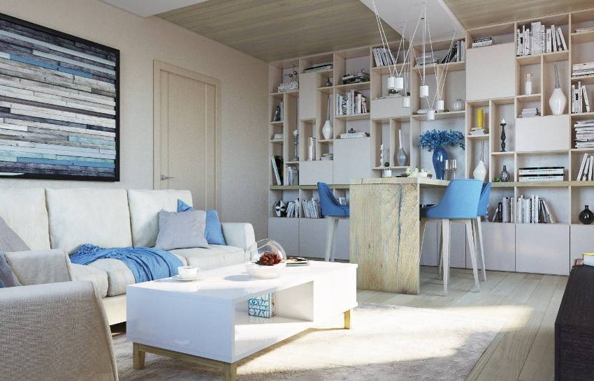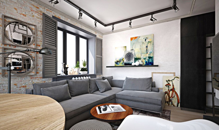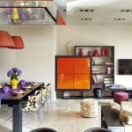 Nasihat berguna! Dalam gaya kontemporari, pangsapuri studio paling sering dilengkapi, membahagi ruangan menjadi zon fungsional menggunakan pelbagai teknik reka bentuk dalam bentuk partisi kaca, perabot, skrin, lantai dan siling bertingkat, yang dapat menjimatkan ruang dengan ketara. Untuk tujuan yang sama, perabot ergonomik terbina dalam dan modular digunakan.