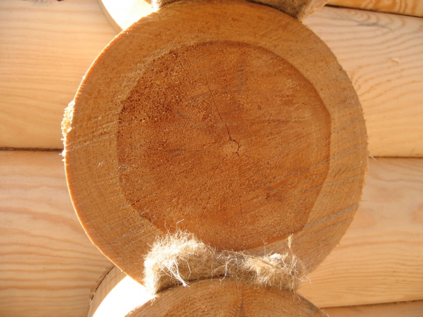 Log untuk meletakkan setiap mahkota berikutnya hendaklah dengan diameter yang hampir sama. Di sini anda harus mengganti sisi produk yang nipis dan tebal untuk mengecualikan kemerosotan struktur. Di antara mereka, bahan penebat panas diletakkan, yang dilekatkan pada bingkai dengan staples, yang menangkal meniup melalui sendi produk. Ini boleh menjadi lumut, rami, duri biji rami, kain rami atau rami.