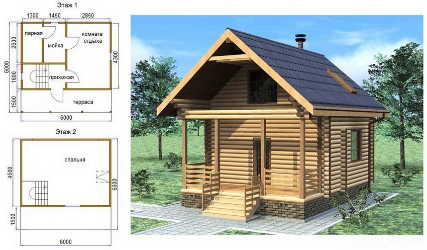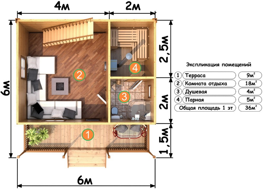 Di samping itu, projek sauna 6x6 dengan loteng menyediakan ruang rehat yang berasingan di tingkat bawah. Ukurannya 8.1 m². Dari bilik ini, tangga menuju ke lantai loteng, yang luasnya 25 m². Terdapat cukup ruang di sini untuk menampung sebuah syarikat besar untuk bersantai atau melengkapkan ruang tamu yang membolehkan penggunaan tempat mandi untuk kediaman tetap atau sementara para tetamu.