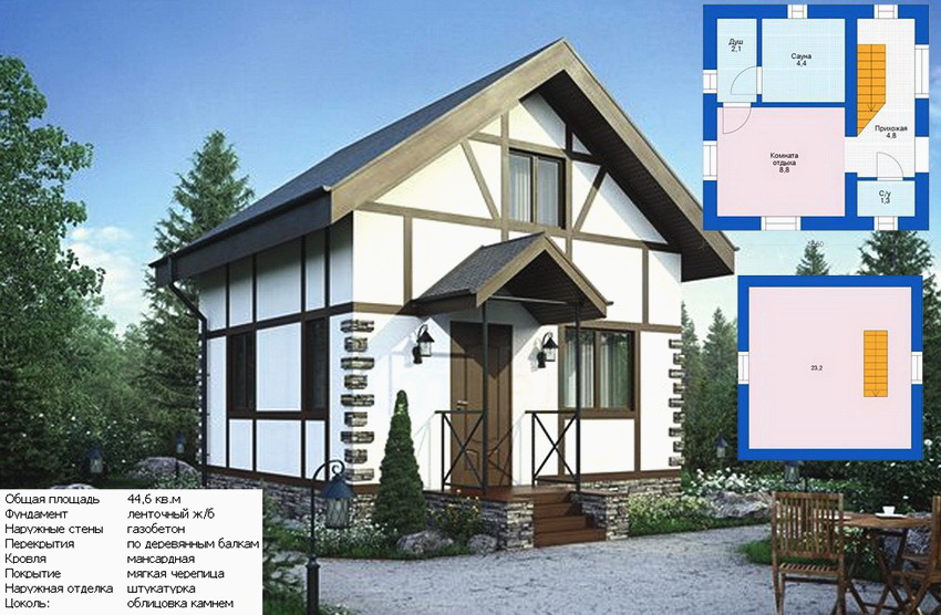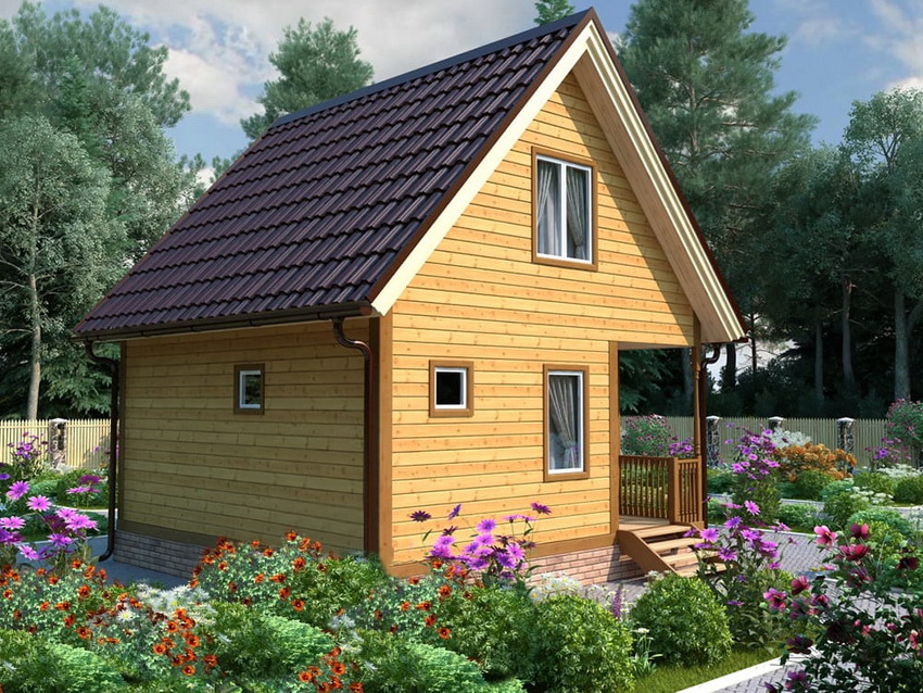 - Rumah mandi dengan loteng kelihatan lebih menarik daripada bangunan satu tingkat biasa.Lebih-lebih lagi, kos struktur sedemikian jauh lebih rendah daripada harga bangunan dua tingkat.