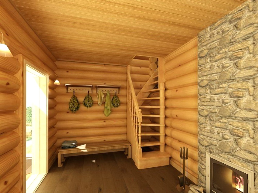 Untuk kemudahan, tab mandi mempunyai bilik cuci dan bilik mandi. Sekiranya kompor dipasang di bilik wap, pembakaran boleh dilakukan terus dari bilik rehat. Ketinggian siling di tingkat bawah adalah 2,1 m, yang memungkinkan untuk memasang rak dua tingkat di bilik wap. Adalah wajar bahawa mereka bersudut. Oleh itu, adalah mungkin untuk meningkatkan jumlah orang yang secara serentak dapat berada di bilik wap.