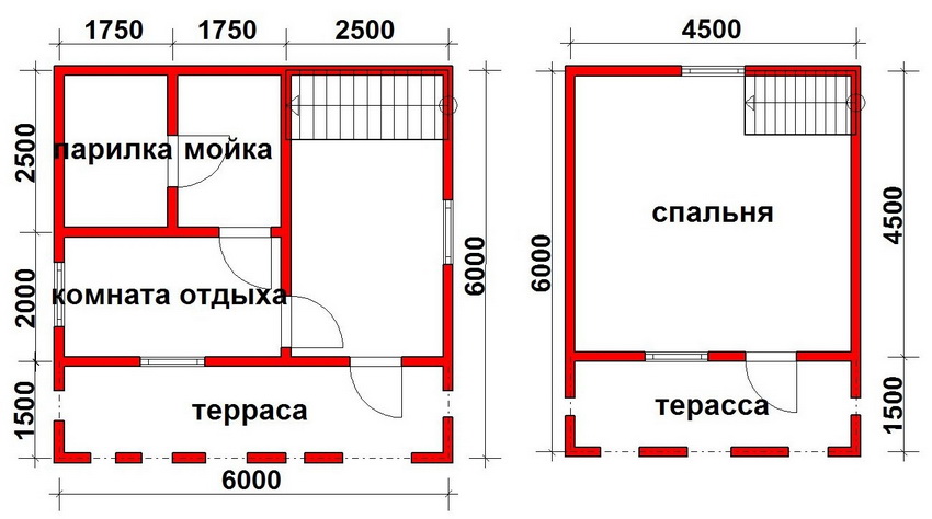 Malah projek bangunan khas boleh berbeza dari segi ukuran dan susun atur dalaman. Selalunya, pemilik pondok musim panas, kerana kekurangan ruang kosong, lebih suka bangunan kompak. Atas sebab ini, yang paling popular adalah projek mandi dengan loteng 6x6 m dan 4x6 m.