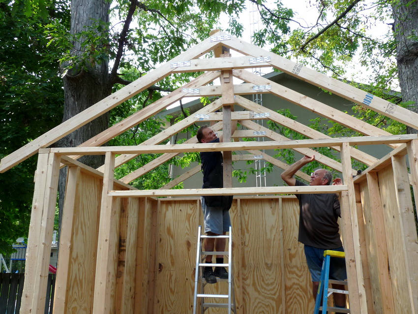 Seterusnya, struktur kasau dipasang, yang terbaik dilakukan di tanah, dan kemudian siap untuk memperbaikinya di rak bingkai. Rakiter ditempatkan dalam jarak kira-kira 0,8 m. Unsur pelat tidak perlu diikat rapat antara satu sama lain. Ini ditentukan oleh jenis bahan bumbung. Sekiranya ringan, maka jaraknya mungkin lebih besar. Sekiranya bumbungnya berat, kasau lebih ketat.
