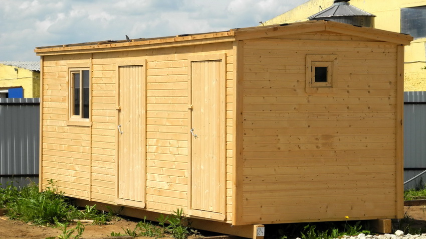 Berdasarkan gambar, blok utiliti kayu do-it-yourself untuk kediaman musim panas sedang dibina dari balok dengan bahagian 100x100 mm dan 100x150 mm.
