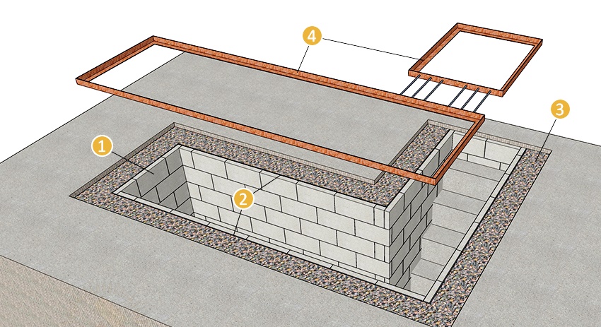 1 - batu blok busa; 2 - kalis air; 3 - batu runtuhan (batu bata pecah atau batu hancur); 4 - sudut 50x50x4