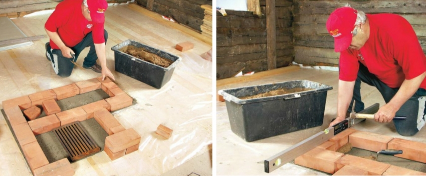Dengan mengambil kira dimensi segi empat tepat yang dilukis di atas lantai, bahagiannya dipotong dari papak minerit dan diskrukan di sepanjang tanda menggunakan skru mengetuk sendiri. Beberapa baris batu bata yang kukuh diletakkan di atasnya. Anda boleh menggunakan bahan merah padat, tetapi fireclay lebih disukai. Pertama, anda perlu merendam batu bata di dalam air.
