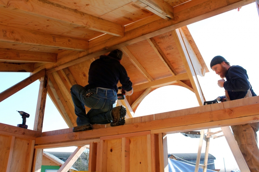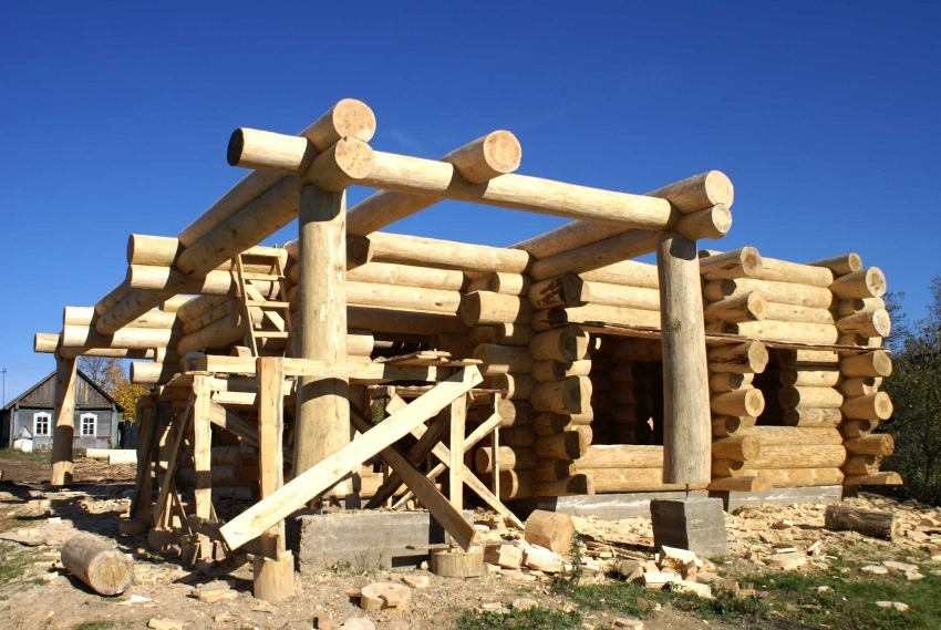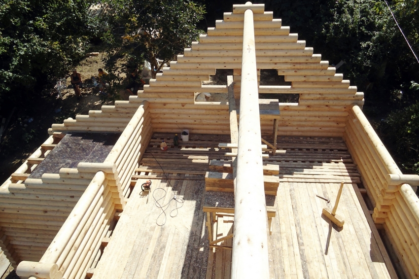 Pemasangan dua baris pertama bahan sedang dijalankan. Untuk pemasangan, anda perlu menggunakan pin, yang mesti dimasukkan ke dalam lubang dengan kuat sehingga strukturnya dipasang dengan sangat kaku dan kuat. Sekiranya ini tidak dilakukan, maka sistem kasau akan memberi tekanan pada mahkota, sehingga merangka rangka. Seterusnya, siling sementara diletakkan. Untuk ini, papan digunakan, yang sebahagiannya tetap. Setelah kerja pembinaan bumbung utama selesai, ia akan dikeluarkan.