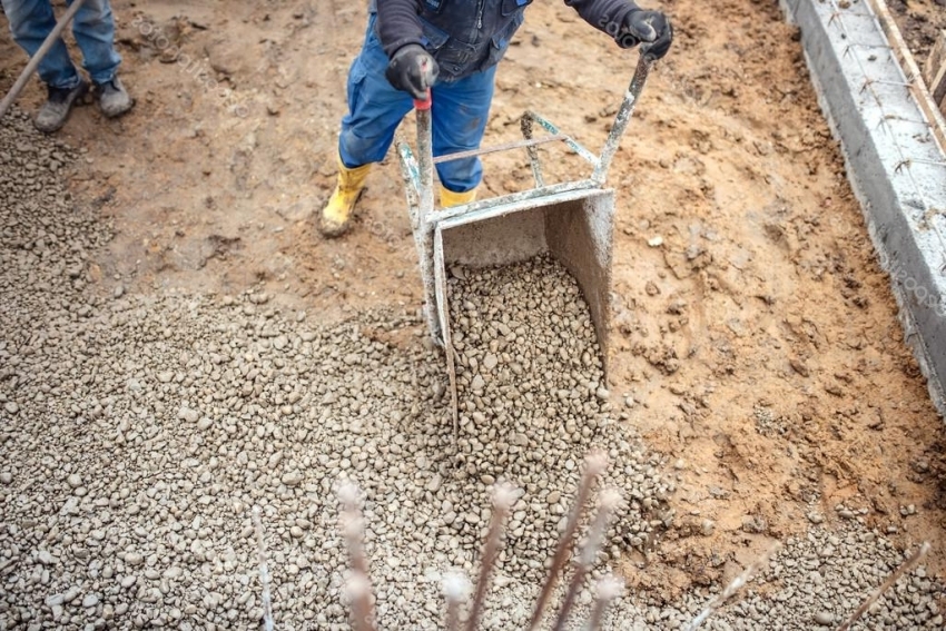 Di samping itu, sambungan pengembangan perlu dibuat. Untuk ini, kepingan EPSP dengan ketebalan 3 cm dipotong.Jahitan diletakkan di seluruh perimeter ruangan, dan juga di sekitar pangkalan yang dimaksudkan untuk memasang oven. Pada tahap yang sama, pendawaian dalaman paip air dan pembetungan dilengkapi. Seterusnya, pasir dan kerikil dituangkan ke lantai, setelah itu bantal dipadatkan. Lapisan konkrit dituangkan di atasnya. Lebih baik menggunakan peraturan untuk meratakan permukaan.