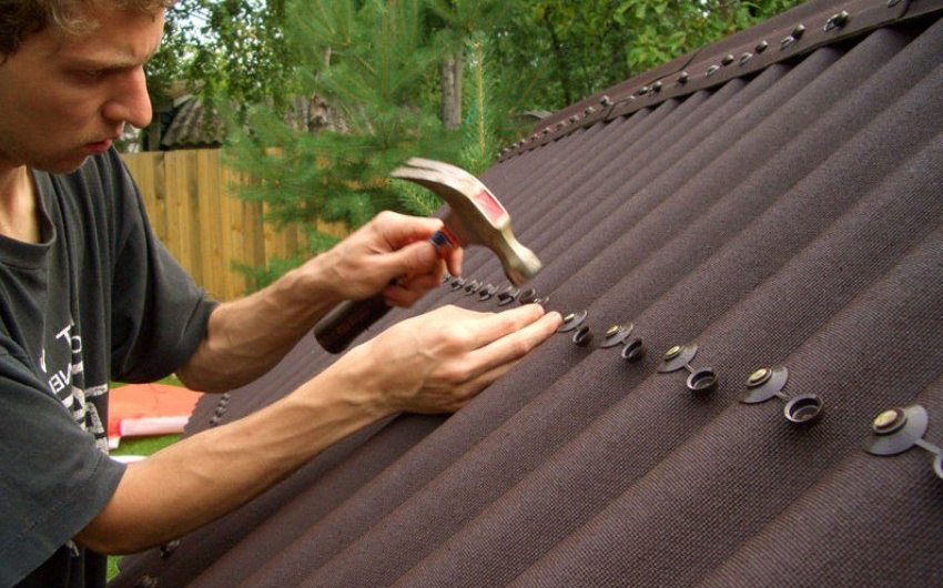 Untuk memasang ondulin, kuku batu tulis biasa sesuai. Pengikat dipasang di sepanjang gelombang atas. Semakin rendah sudut kecenderungan bumbung, semakin banyak kepingan saling bertindih. Dalam kes ini, cukup untuk bertindih sekitar 10 cm. Anda perlu memalu kuku dengan sangat berhati-hati, jika tidak, anda boleh merosakkan gelombang. Sekiranya dikehendaki, sistem saliran ribut dapat disusun di atas bumbung.
