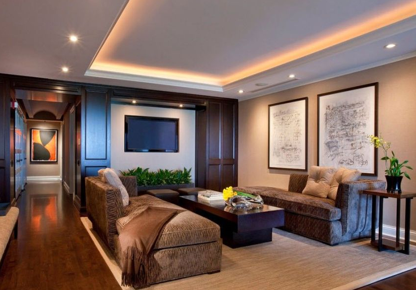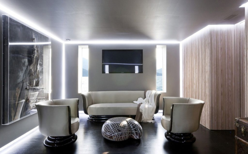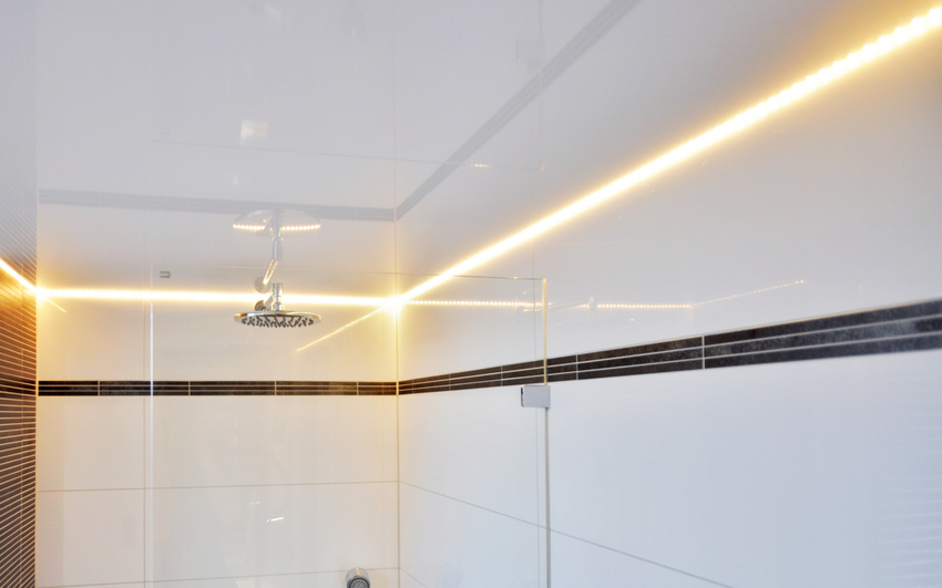 Pencahayaan LED dipasang terutamanya di ceruk antara permukaan tegangan dan tiang siling, yang membolehkannya tersembunyi dari pandangan visual. Dengan mengubah jarak antara sumber cahaya dan permukaan siling, kesan cahaya diperbetulkan. Oleh itu, anda boleh membuat titik aksen yang lebih terang atau mendapatkan pencahayaan yang lembut, seperti yang ditunjukkan dalam foto siling regangan dengan jalur LED.