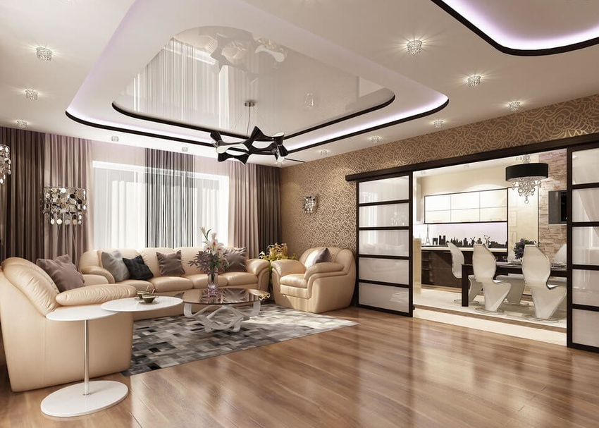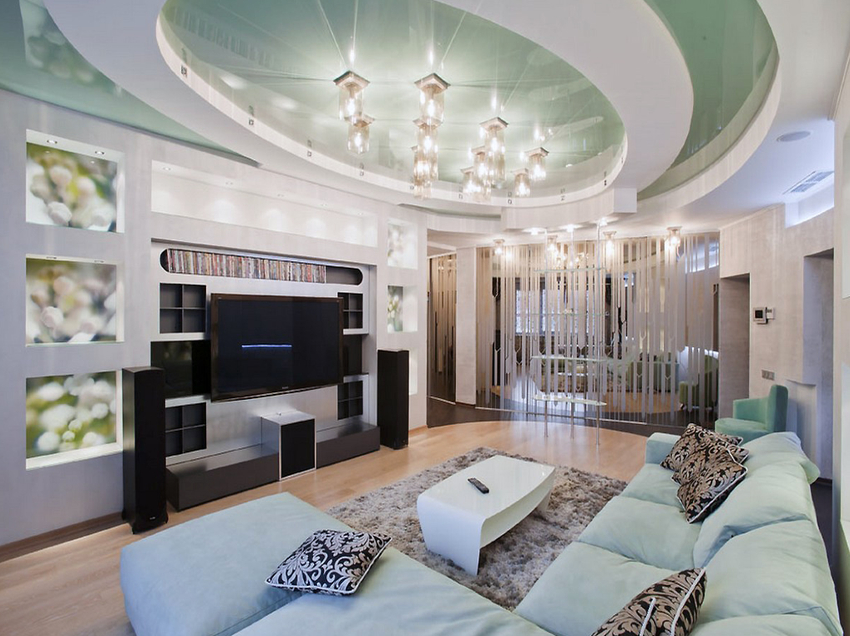 Siling regangan bertingkat bertingkat kelihatan sangat rapi dan asli. Mereka kelihatan paling menguntungkan di bilik tinggi. Di sini anda boleh membuat reka bentuk konfigurasi pelik, yang akan membawa keunikan pada bahagian dalaman. Juga, dengan bantuan siling berbilang tingkat yang meregang, anda boleh mengezon ruangan, dengan menonjolkan titik aksen.