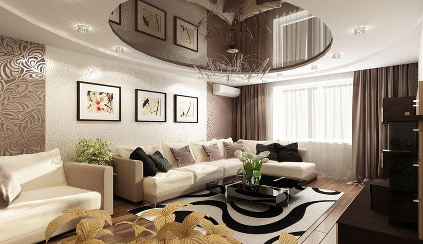 Ruang siling boleh dibuat dalam pelbagai bentuk menggunakan kesan visual yang menarik. Ini akan memberikan keaslian dan keunikan bilik. Yang paling popular adalah reka bentuk persegi, bahagian sisinya dibentuk menggunakan drywall, dan ruang dalam dimainkan dengan kanvas regangan. Reka bentuk ini membawa ekspresi dan dinamisme ke bahagian dalam, memeriahkannya.