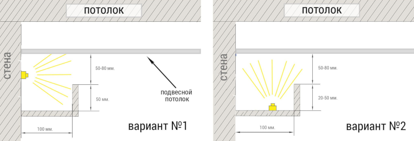 Jenis bahan sejagat memungkinkan untuk memperoleh pencahayaan yang tersebar, yang, dipantulkan dari permukaan dinding, jatuh kembali ke siling, menciptakan ilusi melambung tinggi. Untuk membuat pencahayaan pelbagai arah, digunakan profil dengan lubang dan jurang untuk pencahayaan.