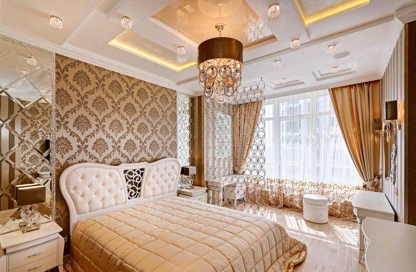 Bahagian dalaman klasik dicirikan oleh simetri dan keterukan garis. Kotak untuk kain regangan boleh berbentuk seperti bentuk geometri. Reka bentuknya sering dilengkapi dengan cetakan atau stuko dengan penyepuhan. Dalam kes ini, kain sintetik putih dipilih.