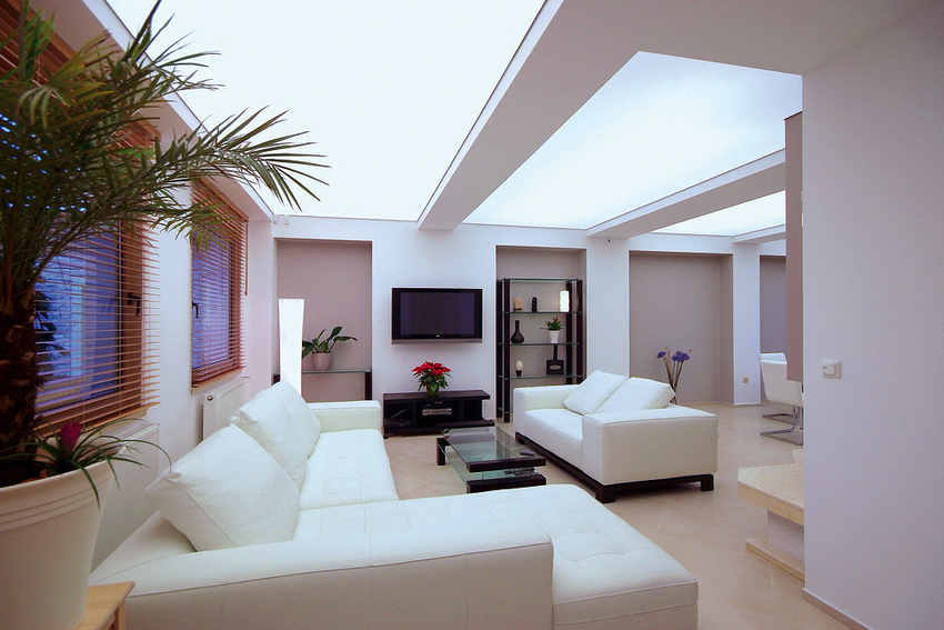 Untuk bahagian dalaman moden, syarat penting ialah pembuatan salutan. Canvas glossy dari naungan cahaya sering digunakan di sini, yang menjadikan ruangan itu elegan.Untuk kesan terbaik, lampu latar dengan kilauan logam digunakan. Untuk realisme pencahayaan tersembunyi, penyelesaian terbaik adalah kawasan aksen di siling, yang dibuat menggunakan percetakan foto. Dalam kes ini, kanvas boleh berbentuk lut sinar, lut sinar atau terapung.