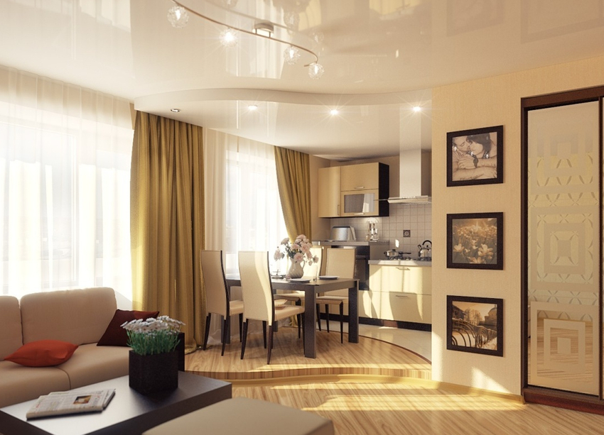 Penyelesaian yang popular adalah susunan langkan berbentuk L atau podium bergelombang di siling. Penyelesaian ini sering digunakan untuk pengezonan ruangan, menciptakan area aksen di dalam ruangan, yang dimainkan dengan pencahayaan tengah atau tambahan, seperti yang ditunjukkan dalam foto siling regangan dua tingkat dengan pencahayaan di dapur.