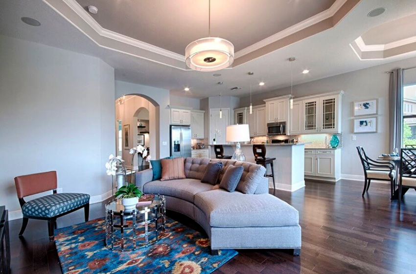 Bahagikan siling regangan dan, bergantung pada kerumitan reka bentuk. Mereka boleh menjadi single atau multi-level. Harga siling yang digantung dengan bentuk sederhana (satu tingkat) akan jauh lebih rendah daripada kos struktur pelbagai peringkat yang kompleks. Pada masa yang sama, seseorang tidak boleh berfikir bahawa jika anda tidak membuat bentuk yang rumit, siling akan membosankan. Anda boleh menambah permukaan mood dengan menggunakan cetakan atau tekstur yang tidak biasa. Kelebihan utama adalah pemasangan pantas dan tidak perlu membuat reka bentuk yang kompleks. Dalam beberapa kes, lebih relevan untuk memasang struktur pelbagai peringkat yang kompleks, ini merangkumi situasi berikut: