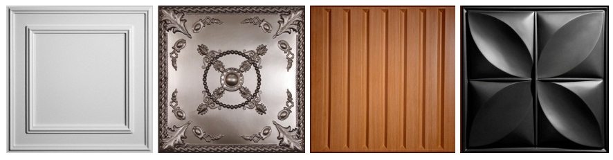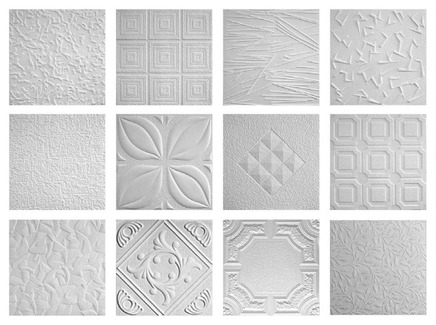 Pilihan jubin paling sederhana mempunyai warna busa putih biasa dengan hiasan yang tidak bersahaja di permukaan depan. Mereka bertujuan untuk menyelesaikan siling untuk melukis dengan komposisi berasaskan air. Atas sebab ini, mereka tidak mempunyai permukaan berkilat, yang memastikan penyerapan dakwat yang baik. Kos jubin biasa adalah minimum, jadi kos membelinya tidak melebihi kos mengecat siling dari kawasan yang serupa.