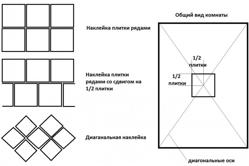 - Kami membuat penandaan siling dengan betul. Untuk melakukan ini, lukis pepenjuru dan tandakan persimpangannya. Seterusnya, kami menghubungkan titik tengah sisi berlawanan dengan segmen. Semua garis yang dihasilkan harus bersilang pada satu titik. Ini adalah bahagian tengah bilik. Penjagaan mesti diambil candelier ada di sini, jika tidak, siling akan kelihatan jelek. Melalui titik tengah, garis tegak lurus dipotong dengan tali cat, di sepanjang baris pertama jubin berorientasikan.