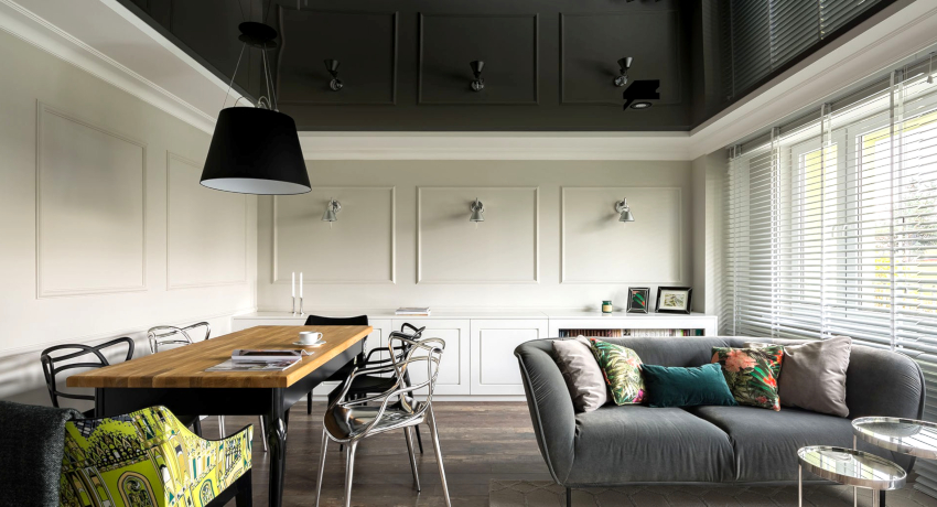 - Yang hitam. Warna yang popular untuk membuat dalaman moden yang tidak remeh, terutama pada kemasan yang berkilat. Anda tidak hanya boleh menggabungkan siling hitam dengan dinding gelap, bahkan semasa membuat bahagian dalaman gothic.