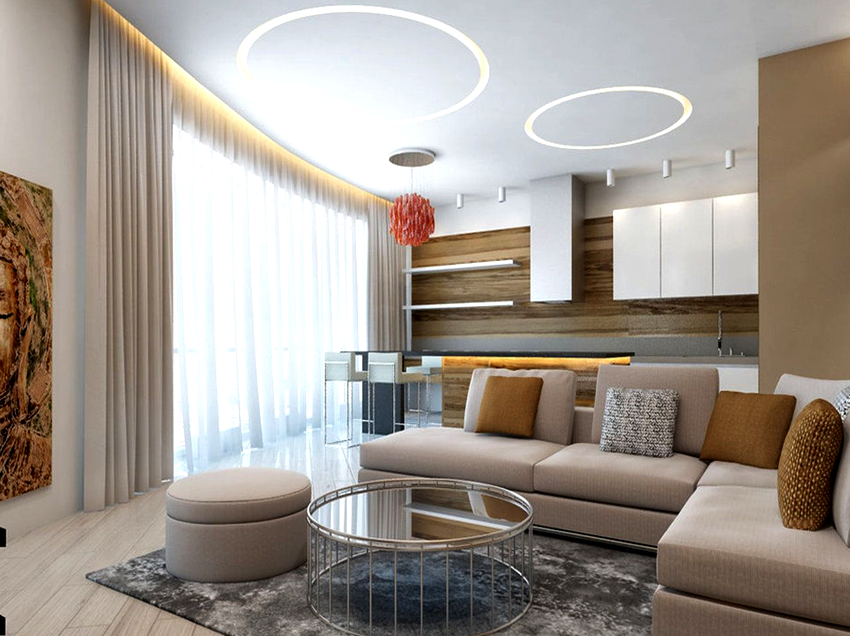 Semasa melakukan struktur bertingkat, anda harus memahami bahawa pilihan ini akan mengambil sekurang-kurangnya 10-15 cm dari ketinggian bilik. Oleh itu, jika siling lebih rendah daripada standard, lebih baik menolak idea seperti itu. Secara umum, struktur pelbagai peringkat kelihatan menarik dan tidak biasa. Amat baik untuk menggunakan pilihan ini di bilik yang luas di mana perlu untuk melakukan pengezonan ruang: