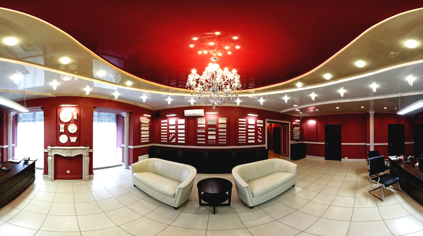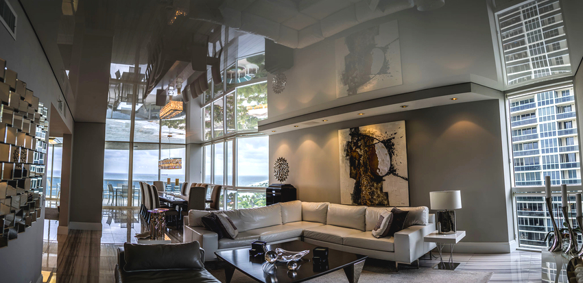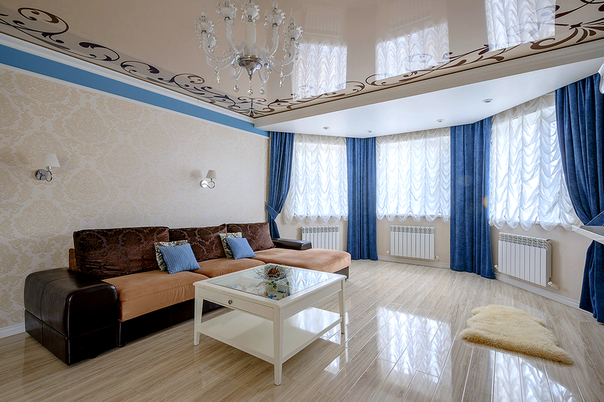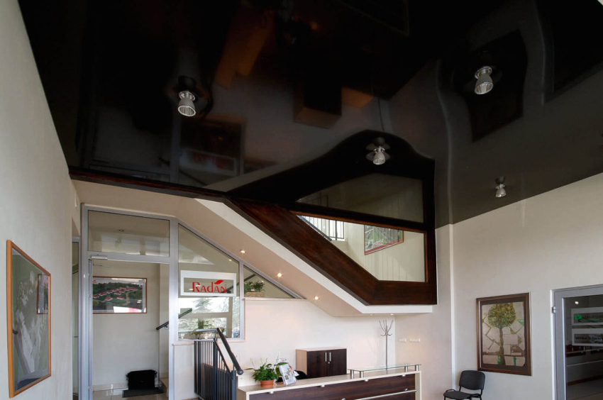 - Berkilat. Selalunya, terdapat jenis kanvas berkilat dalam foto siling regangan untuk dewan, kerana dengan bantuannya, mudah untuk menutup kawasan yang luas dan melakukan pengezonan. Siling cermin berfungsi dengan baik untuk bilik yang kurang terang.