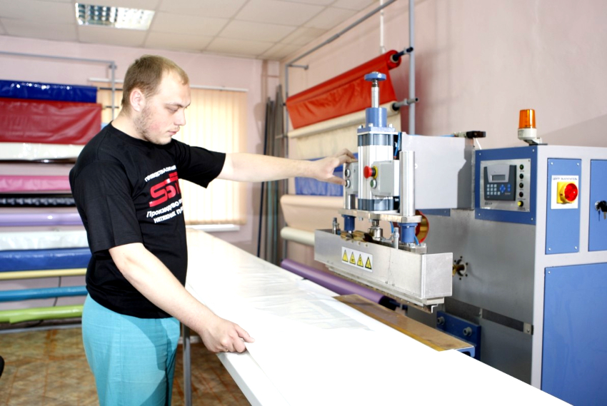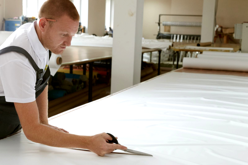 - Selepas itu, pemotongan dilakukan di bengkel peralatan profesional. Agar tidak mendapat lipatan pada kanvas setelah memotong secara tidak sengaja, filem ini dilapisi dengan bahan khas.