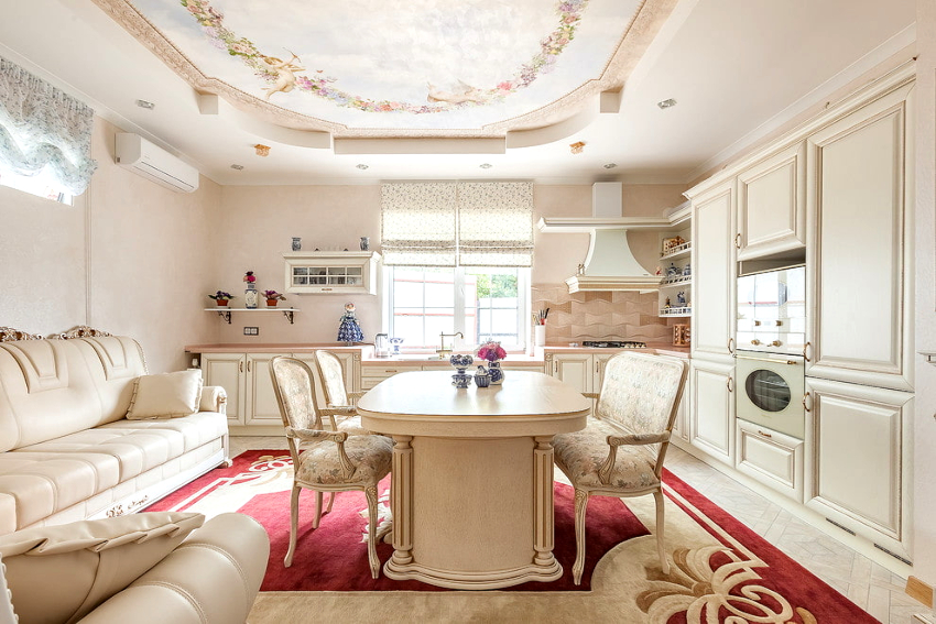 - Melengkung. Bentuk siling berkubah secara radikal mengubah penampilan bilik. Biasanya pilihan ini digunakan di ruang tamu atau dewan, mewujudkan peralihan yang lancar dari siling ke satah dinding. Contohnya, dengan cara ini mereka menggambarkan langit berbintang atau hari yang cerah dengan awan terapung di permukaan biru.