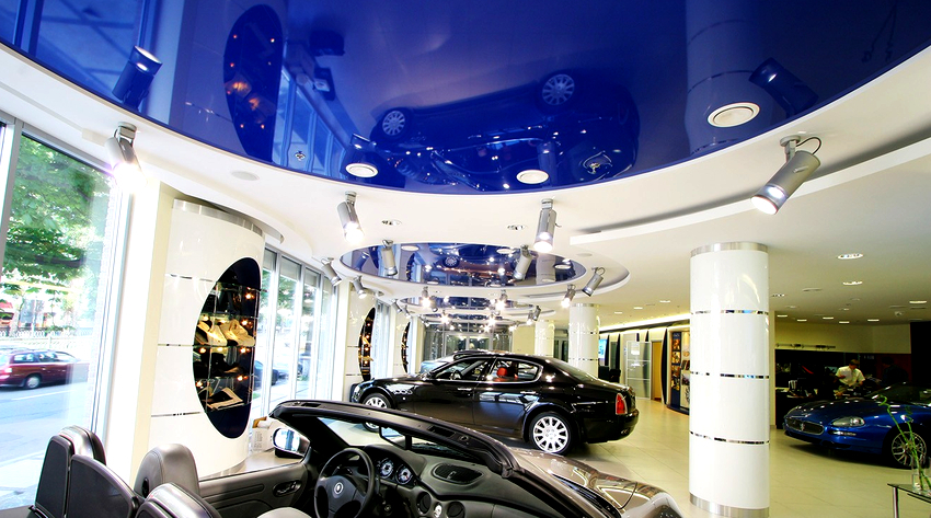 Sejumlah besar siling regangan disajikan di lantai perdagangan. Jenis bahan sangat pelbagai, berbeza warna dan teksturnya. Berkat pilihan yang luas, adalah mungkin untuk membuat siling yang sesuai untuk gaya dalaman apa pun: