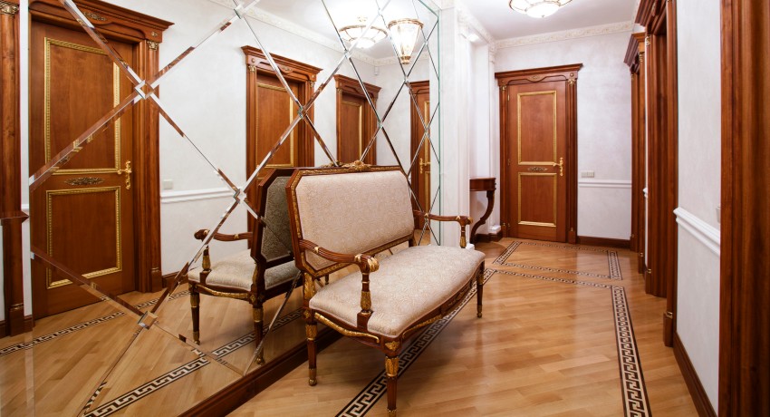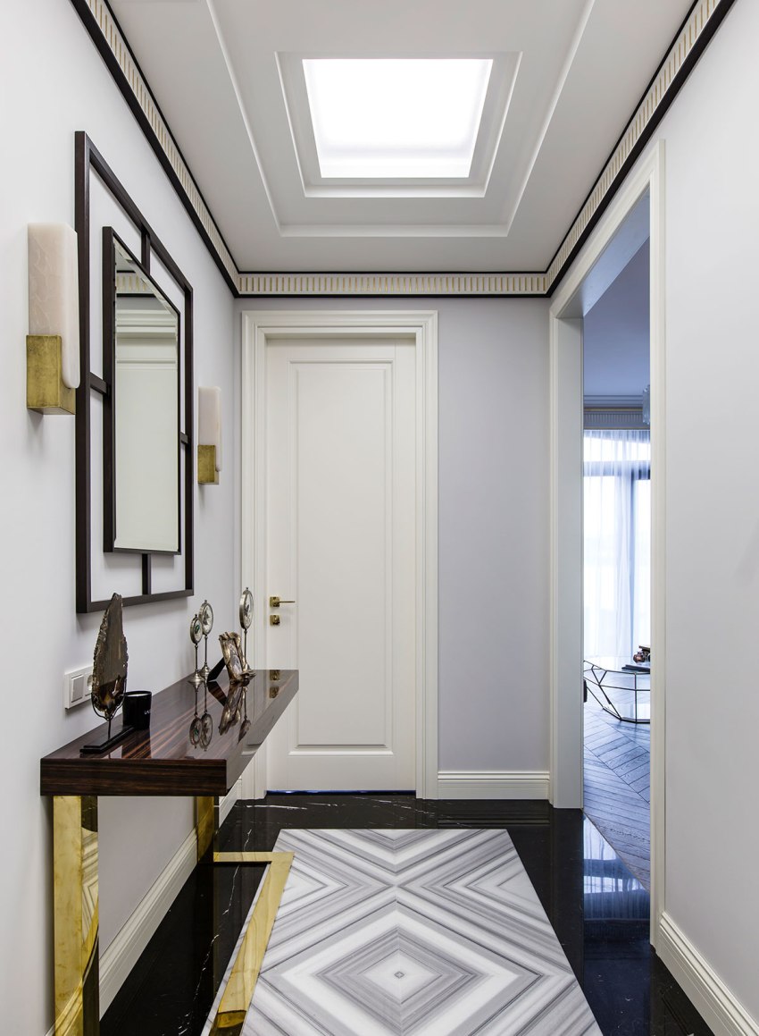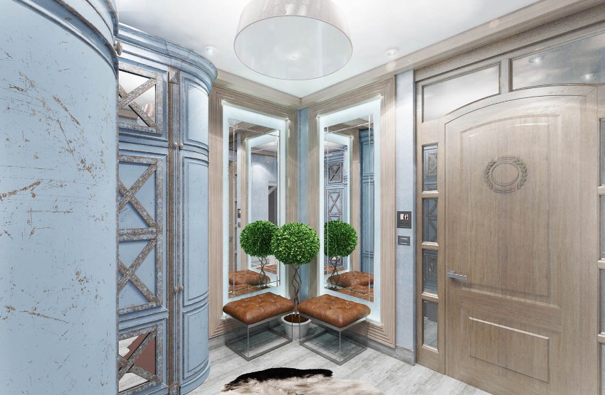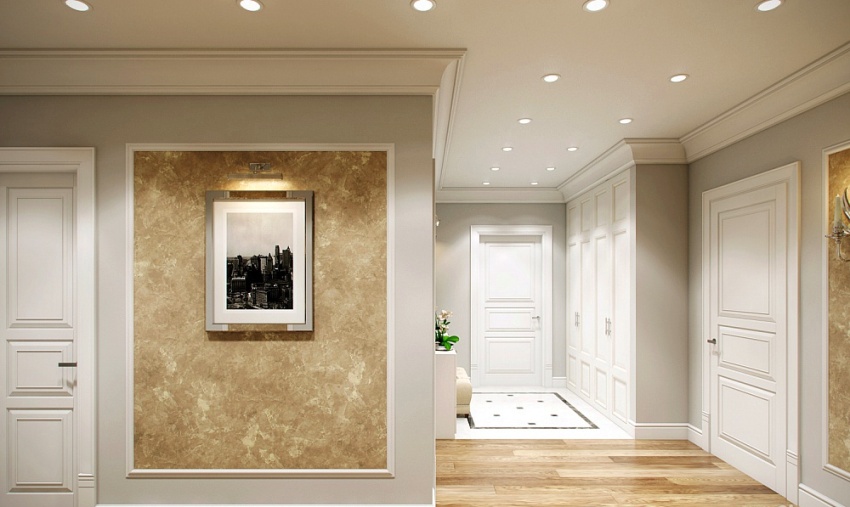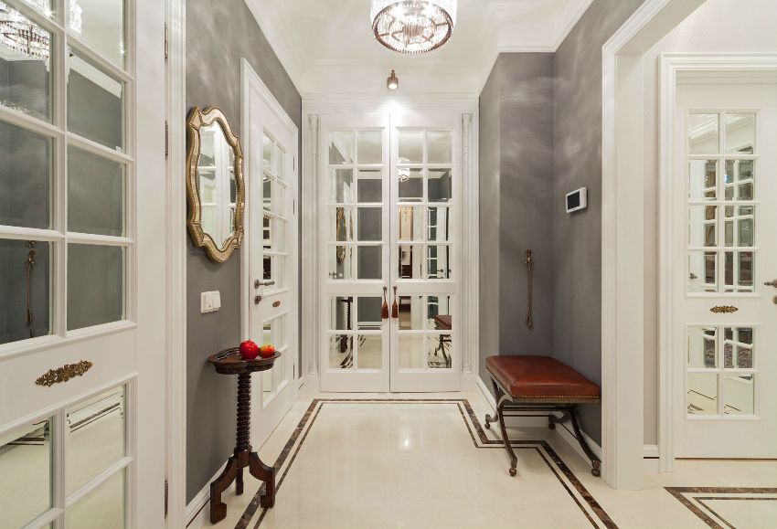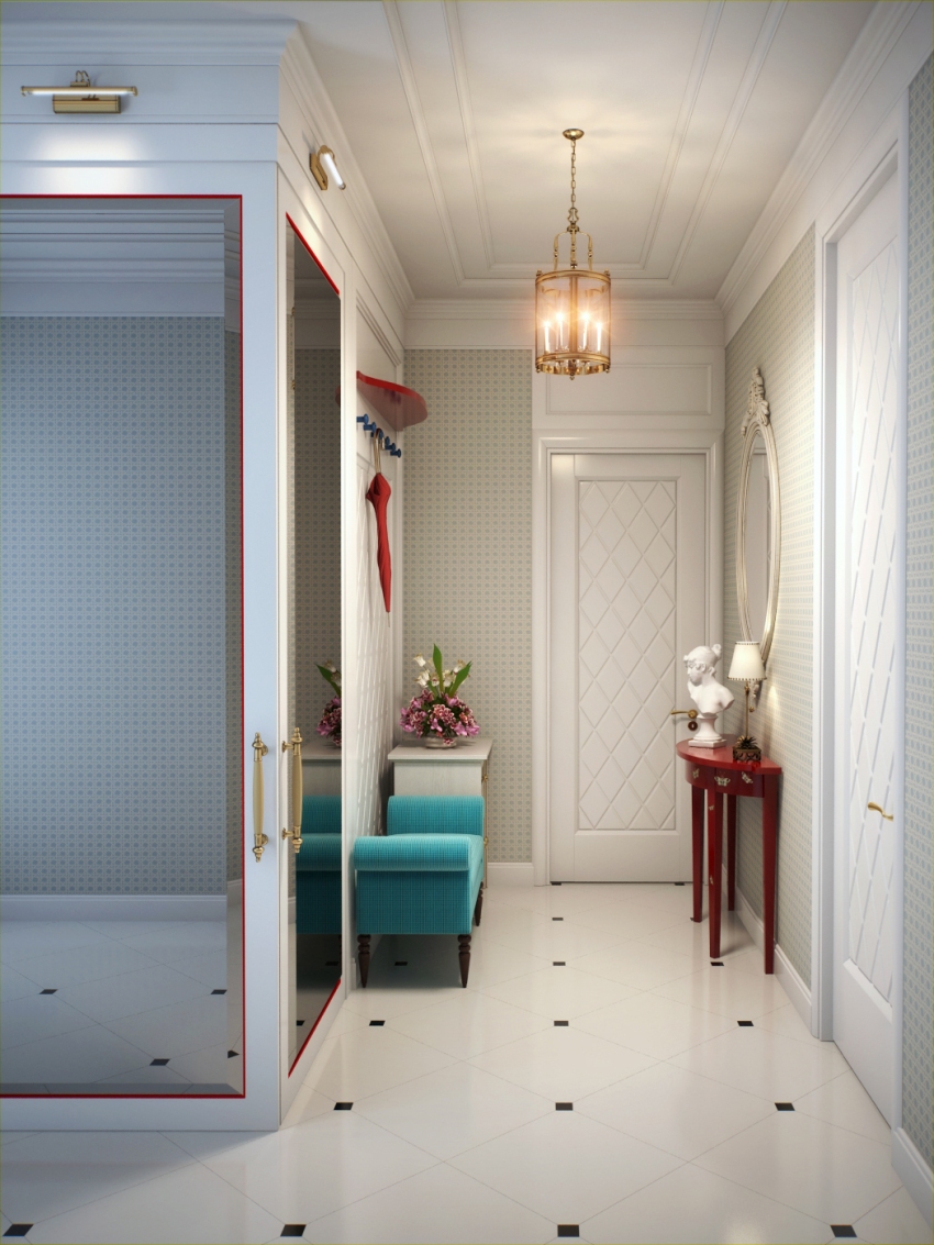Sekiranya kawasan pintu masuk mempunyai bentuk geometri yang betul, tidak seharusnya ada masalah dengan reka bentuk bilik. Peraturan ini berlaku untuk lorong segi empat dan persegi. Tidak sukar bagi pemilik bilik seperti itu untuk membuat dalaman simetri yang memenuhi semua standard gaya klasik.
