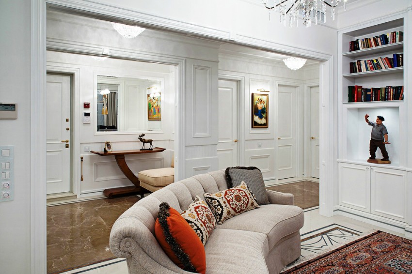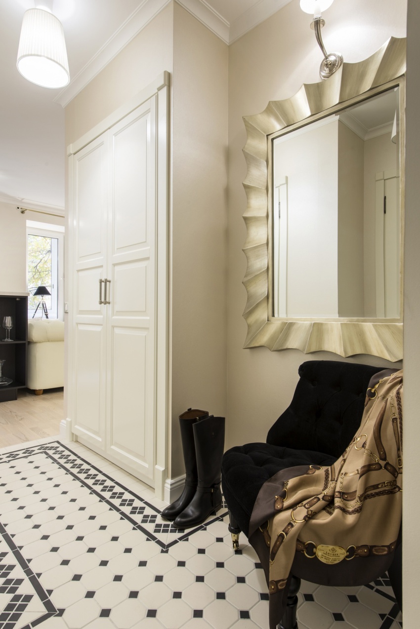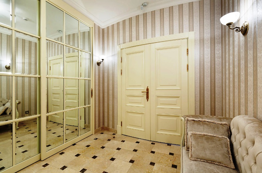 Nota! Klasik kelihatan hebat hanya jika tidak ada barang yang berlebihan di dalam bilik. Oleh itu, hanya barang keperluan yang harus ditinggalkan di lorong, dan lebih baik membuang sampah.