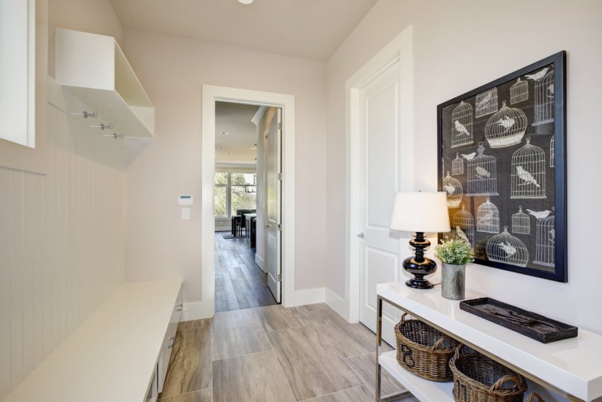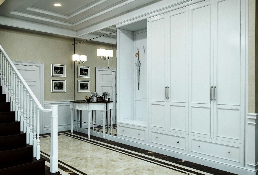 Lorong serbaguna dalam gaya klasik: warna putih dan neutral