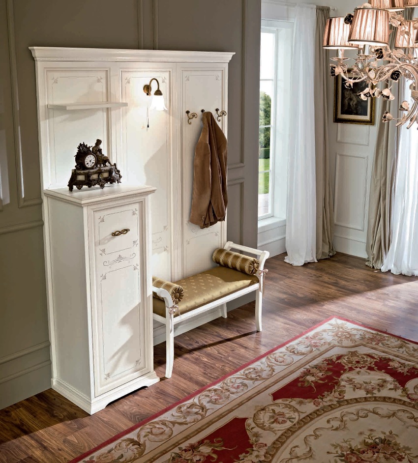 Sebilangan besar perabot gaya klasik dibuat dengan warna terang. Oleh kerana itu, menjadi mungkin untuk meningkatkan ukuran bilik secara visual. Produk ini kelihatan bangsawan dan pada masa yang sama tidak mengganggu. Terima kasih kepada perabot yang dipilih dengan baik, anda boleh mendapatkan ruang masuk yang elegan dengan reka bentuk mulia yang tidak akan pernah bosan. Antara keburukannya, hanya kos yang tinggi yang diberi perhatian.