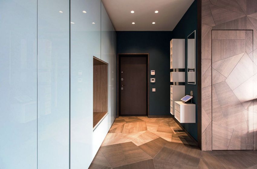 Nasihat berguna! Untuk memperpanjang umur parket di lorong, disarankan untuk meletakkan lapisan tahan aus, seperti jubin, sebelum masuk. Jubin boleh menjadi polos atau dihiasi dengan hiasan geometri.