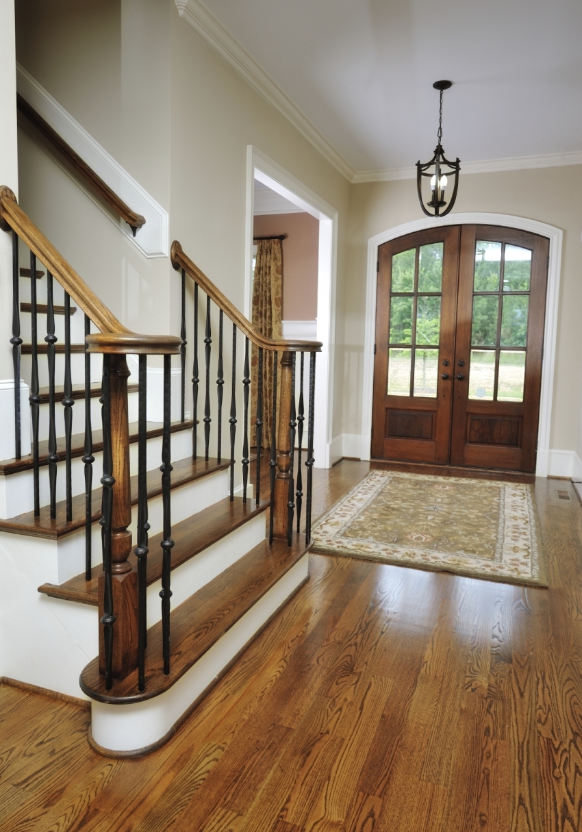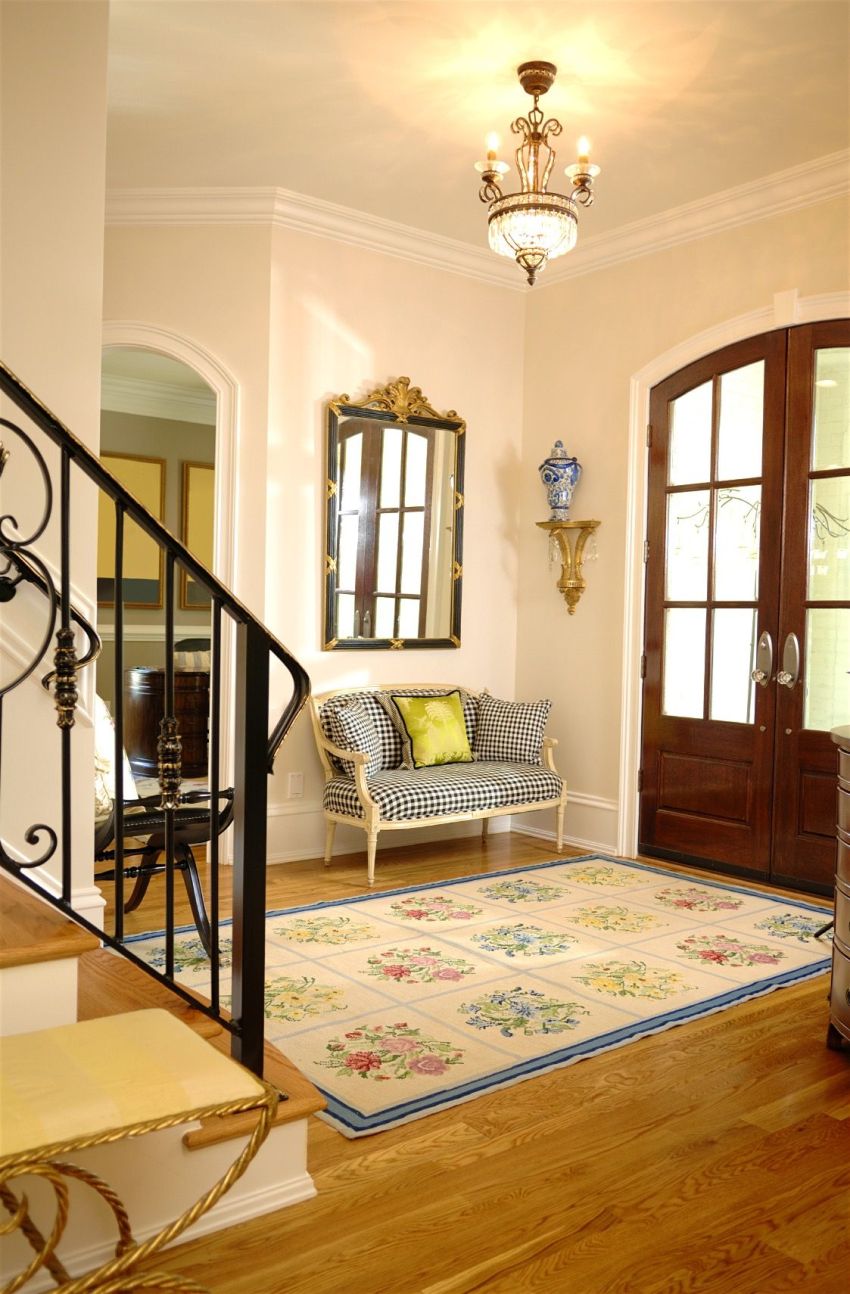 Kawasan pintu masuk biasanya diserlahkan dengan lantai. Sekiranya siling di rumah tinggi, siling dua tingkat yang digantung dapat melakukan fungsi pemisahan. Berkat pencahayaan tambahan, reka bentuk ini secara visual menekankan sempadan antara ruang tamu dan lorong.