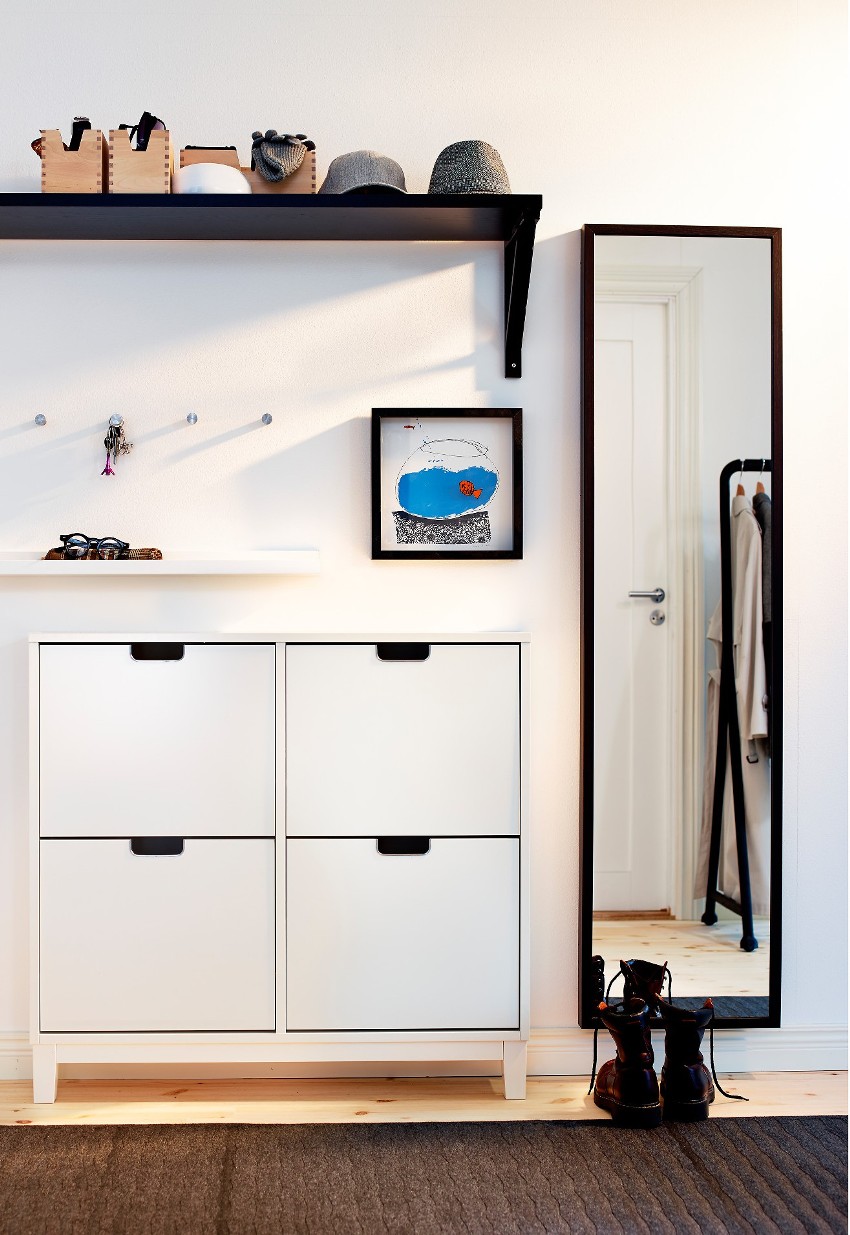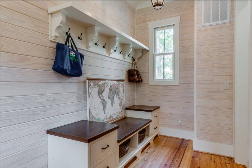Penyangkut dinding dengan rak kasut di lorong tidak akan memakan banyak ruang, tetapi akan mengosongkan ruang maksimum
