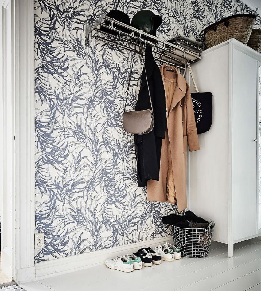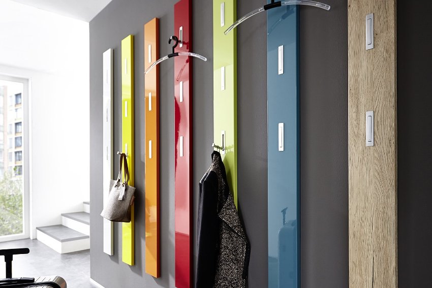 Penyelesaian yang tidak biasa adalah penggunaan pelekat dalaman khas di dinding, yang kemudian dipilih cangkuk yang sesuai dengan warna pelekat itu sendiri. Pilihan ini adalah optimum untuk koridor memanjang kecil.