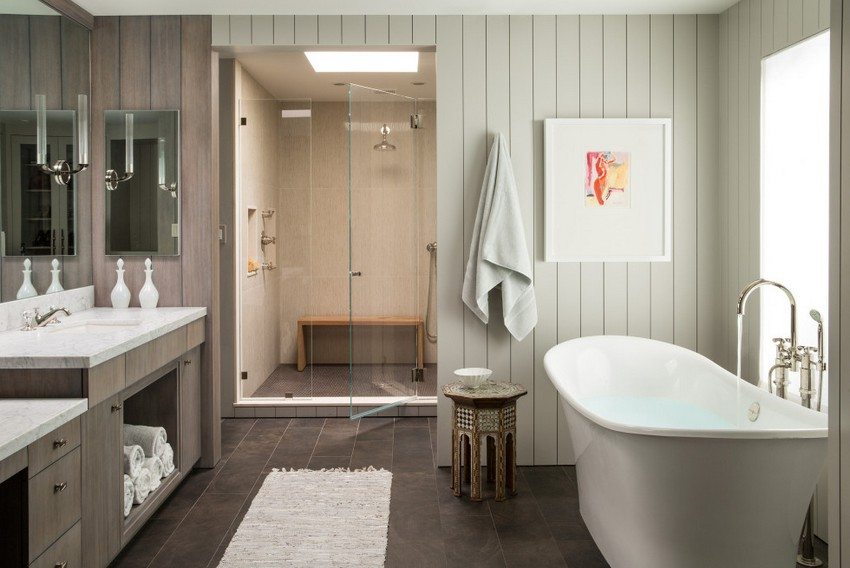Bahagian dalaman yang mesra alam sangat popular sekarang ini. Sudah tentu, plastik tidak tergolong dalam kategori bahan mesra alam dan semula jadi, tetapi dalam foto bilik mandi, panel PVC dengan tekstur kayu menghasilkan tiruan gaya etno yang sangat baik. Pemasangan panel pvc di bilik mandi di dinding digabungkan dengan hiasan siling yang dibuat dengan bilah.
