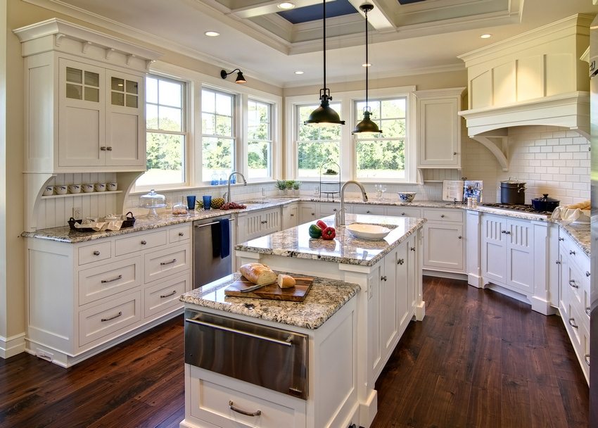 Dalam kebanyakan kes, dalam foto siling yang diperbuat daripada panel PVC di dapur, anda dapat melihat bahan yang meniru lapisan selebar 10 cm. Kemasan ini tanpa masalah membolehkan anda memasang lampu jenis titik dalam struktur siling yang digantung.