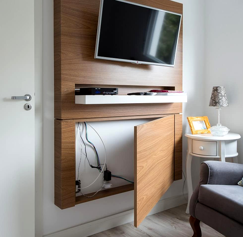 Pendawaian boleh disembunyikan di sebalik perabot yang berdekatan dengan TV. Penyelesaian yang ideal dalam kes ini ialah menukar perabot, di mana semua kabel dan kabel akan tersembunyi. Terdapat area khusus di dalamnya untuk meletakkan TV, yang dalam hal ini dapat dipasang ke dinding atau panel perabot belakang.