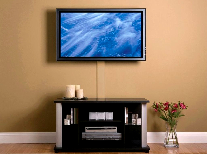 Penting! Semasa memutuskan cara memasang TV di dinding, anda perlu menentukan lokasi peralatan tambahan untuk memasang sejumlah cawangan yang diperlukan, serta memikirkan pilihan untuk pemasangan produk kabel yang tersembunyi.