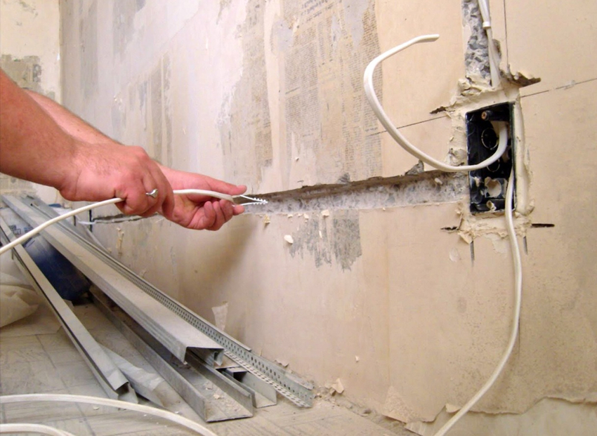 Bagaimana cara menyembunyikan wayar di dinding dengan cara tertutup? Pilihan ini melibatkan penghalaan kabel di saluran yang dibuat sebelumnya. Kaedah ini dilakukan pada peringkat pengubahsuaian premis. Urutan kerja ditentukan oleh jenis asas.