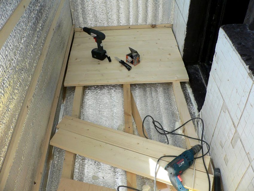 Adalah mungkin untuk melengkapkan dan melindungi lantai di balkoni tanpa menggunakan lapisan konkrit. Untuk melakukan ini, setelah susunan kalis air, balak kayu diletakkan di arah longitudinal balkoni, yang dilekatkan pada dasar konkrit. Di antara kayu bulat, bahan penebat panas diletakkan - penoplex, bulu basalt, tanah liat yang diperluas, dll. Papan atau bahan lembaran (papan lapis, papan serpai, dll.) Dilekatkan pada kayu balak dan lantai penamatnya dilengkapi.