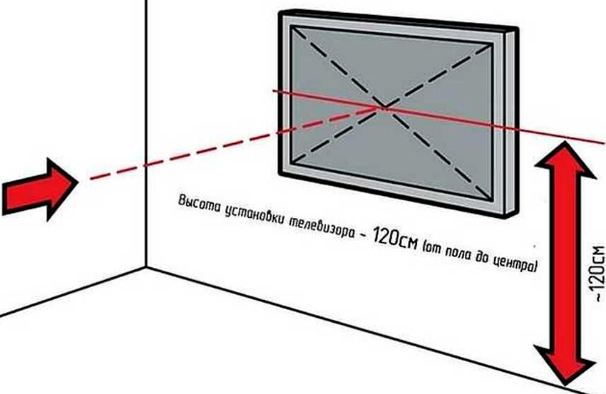 Untuk menentukan berapa tinggi dari lantai untuk menggantung TV di dewan, anda harus duduk dengan selesa dan melihat langsung ke dinding. Kepala tidak boleh dilemparkan ke belakang, agar tidak menimbulkan beban pada tulang belakang serviks. Arah mata akan menunjuk ke titik yang seharusnya berada di tengah-tengah skrin.