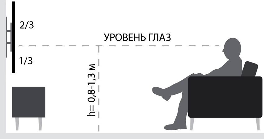 Penting! Semasa memilih ketinggian TV berbanding dengan dinding, anda juga perlu mempertimbangkan ketinggian perabot tempat duduk.