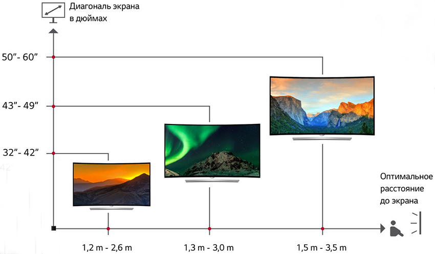 Memikirkan jarak ke TV, kebanyakan pakar oftalmologi telah mencapai kata sepakat. Perlu bahawa peranti berada pada jarak optimum dari tingkat mata, yang dikira dengan mengalikan ukuran pepenjuru dengan faktor 2. Sudut sisihan dari peranti tidak boleh melebihi 30 °. Nilai optimum ialah 15-20 °. Semakin rendah nilainya, semakin baik kedudukan mata ini. Ambang minimum yang boleh diterima ialah 10 °. Sekiranya lebih rendah, mata akan sangat tegang ketika melihat gambar.