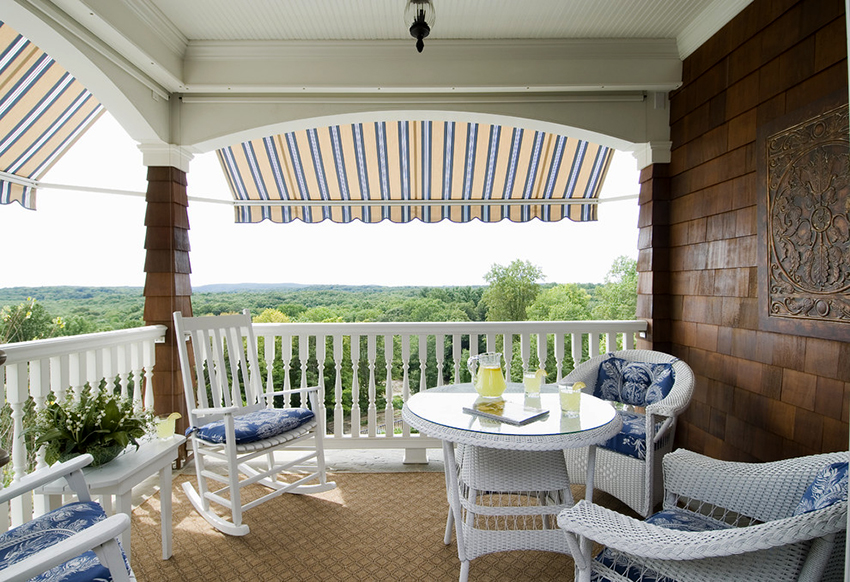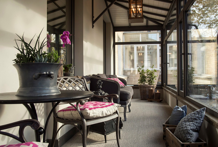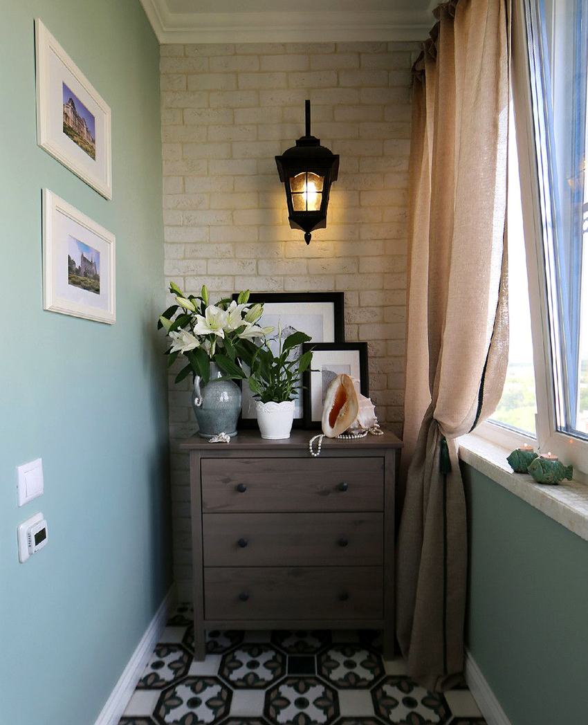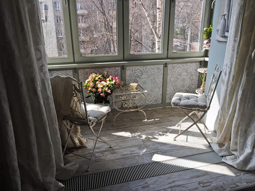 Provence. Perbezaan ciri gaya adalah kehadiran perabot dan aksesori vintaj. Nada semasa adalah ungu, biru pucat, pirus dan lavender. Sangat popular menggunakan batu dan kayu untuk hiasan. Lantai dan siling terbuat dari kayu semula jadi. Adalah wajar untuk memasang sofa dengan banyak bantal di balkoni.