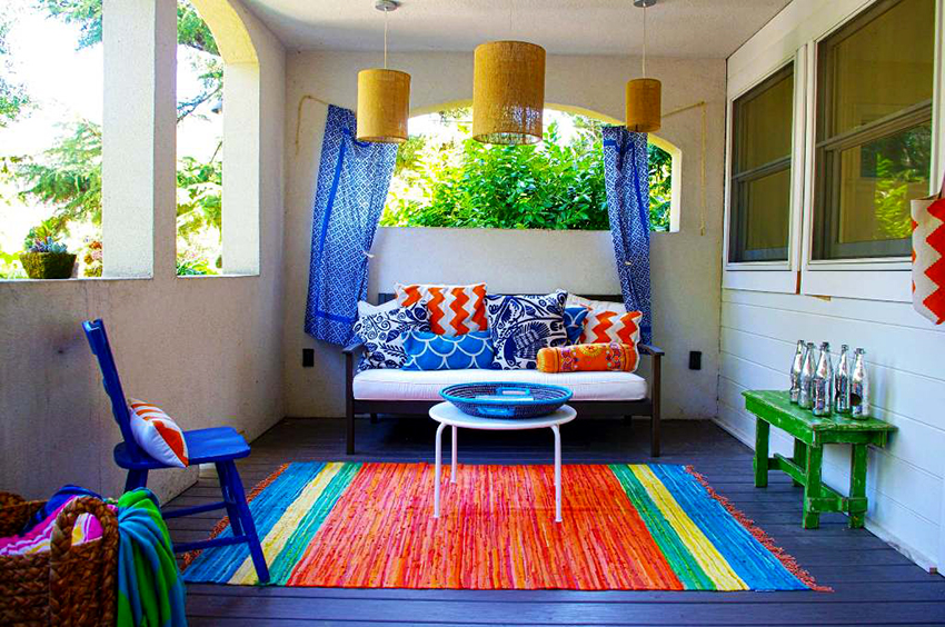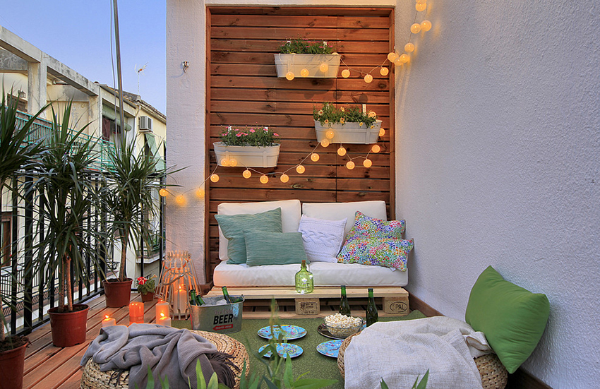 Sekiranya tujuan utama balkoni adalah ruang rekreasi, warna pastel yang hangat dan aksesori yang selesa juga harus disukai dalam hiasan, seperti: